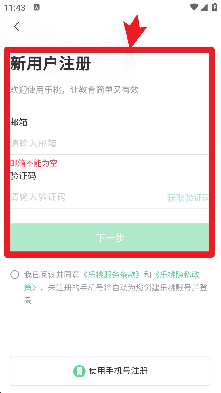 1. 打开App进入注册页面,填写邮箱与验证码后点击下一步,开始创建新用户账号。