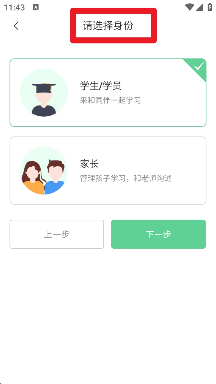 2. 注册成功后选择身份类型,可在学生、学员或家长之间进行选择,便于后续权限分配。