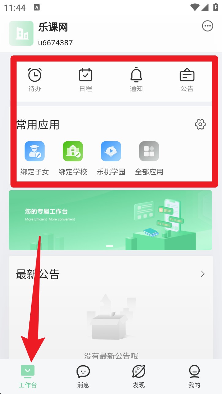 3. 进入工作台首页后,可查看待办、日程、通知、公告等模块,也可绑定子女或学校。