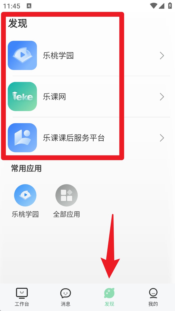 4. 切换至发现页面,可浏览乐桃学园、乐课网及课后服务平台,获取丰富教育资源。