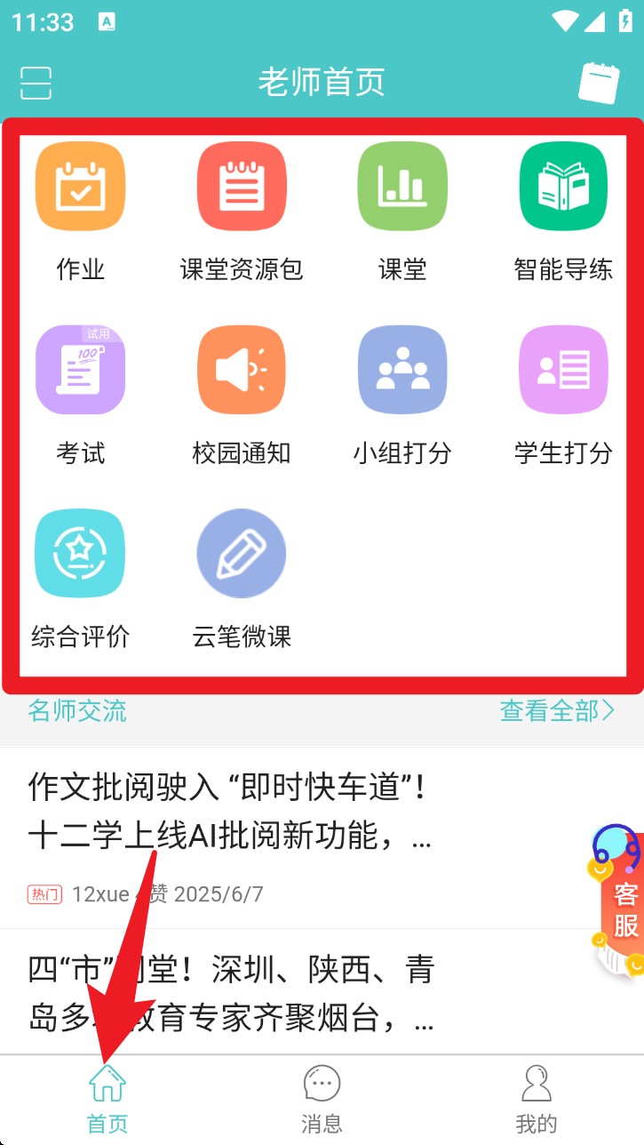 1. 进入首页可看到各类功能图标,包括作业、课堂资源包、课堂、考试、通知等,可按需点选进入操作。