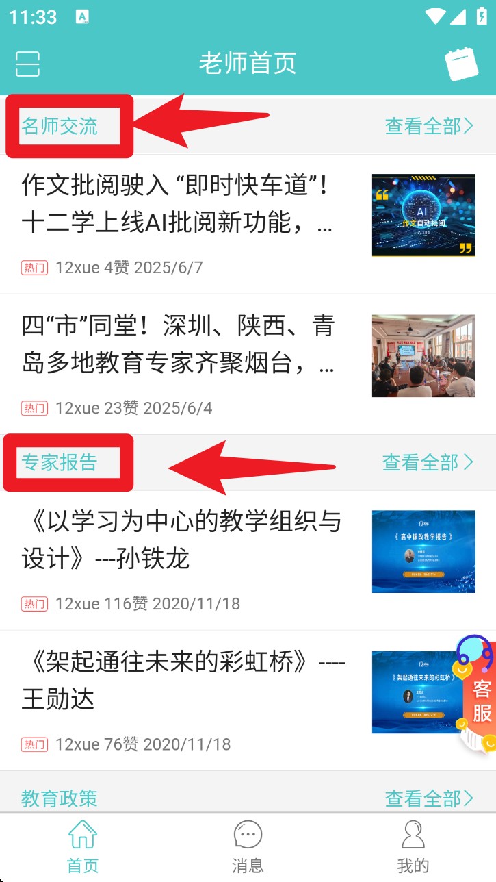 2. 向下滑动首页可浏览名师交流、专家报告等内容,点击标签即可查看教育资讯与专业讲座。