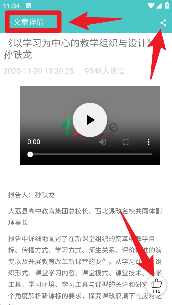 3. 在文章详情页查看报告或教学观点时,可点击右上角进行分享,也能点选右下角图标进行点赞互动。