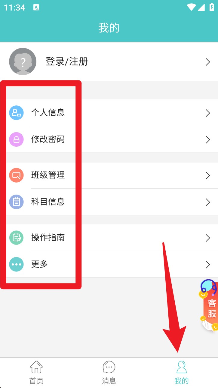 4. 点击底部我的按钮,进入个人中心,可管理个人信息、修改密码、查看班级与科目信息等资料。