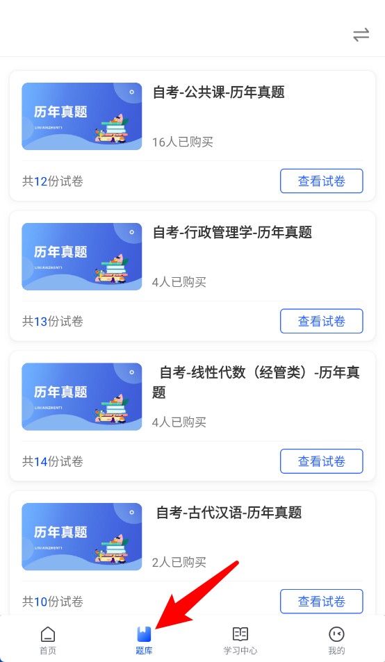 2、题库页面汇总各类历年真题与试卷,支持自考、职考等不同科目分类浏览与试题查看。