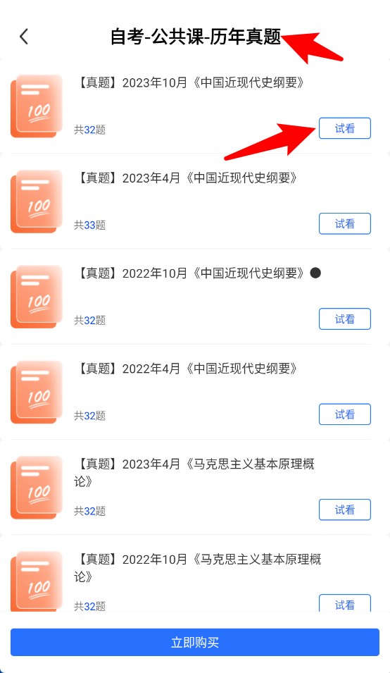 3、点击具体题库后可浏览详细试卷列表,选择试卷进入试看体验具体题目内容。