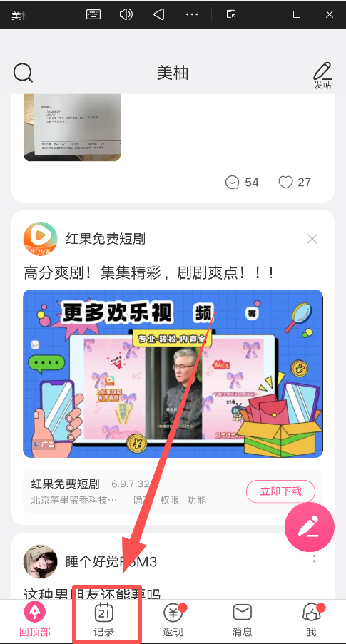 1、打开美柚APP,在界面底部的功能导航栏中,找到并点击"记录"选项;