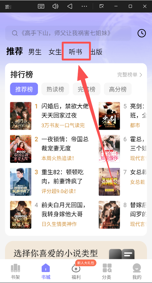 1、首先在主页点击底部的“分类”,接着找到顶部的“听书”入口。