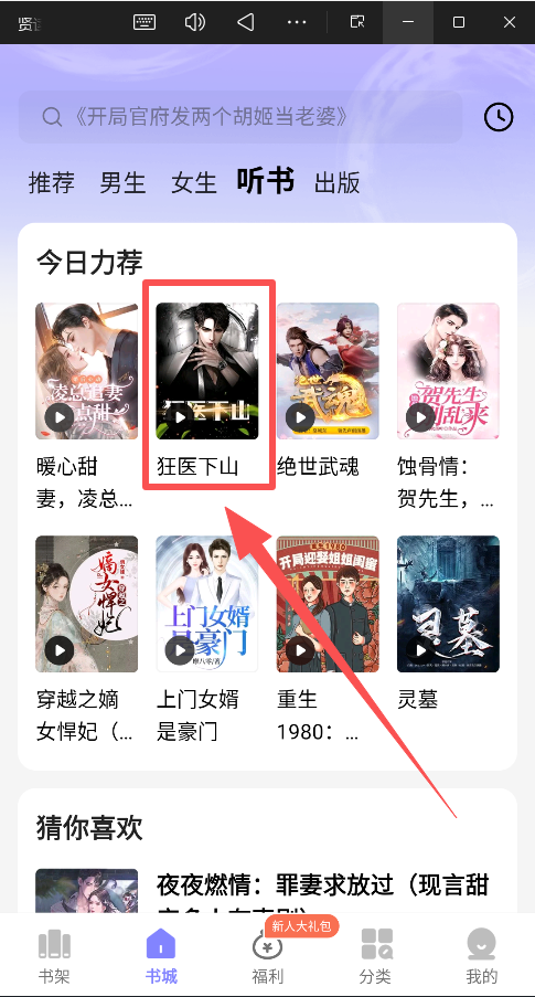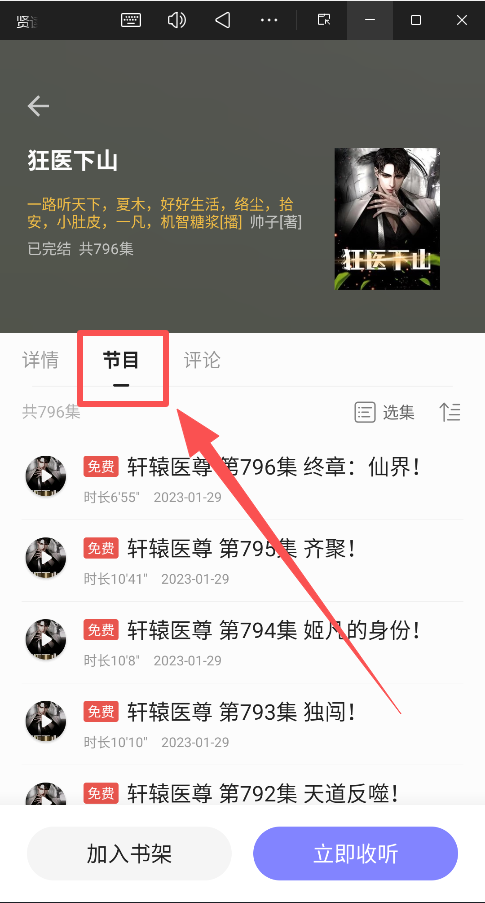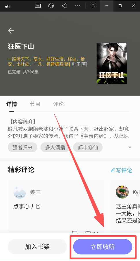 3、以《狂医下山》为例,点击“开始收听”就可。