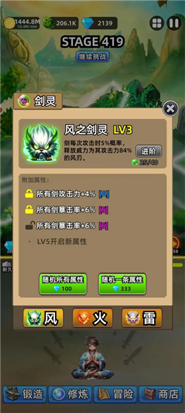 剑灵就是这个游戏玩法的核心了。因为剑多,所以剑灵加持的属性就非常非常高,比你想象得更高。每日任务刷完,至少有一个剑灵可以升到LV3。然后刷新剑灵属性,只需要刷出来一个S级加技能伤害类得特性就可以了。然后根据这个技能去刷新每把剑得附魔。(比如说剑灵刷出来雷击+伤害或者加数量的,那么剑灵就去刷雷击概率和雷击伤害)