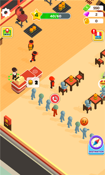 3.快速升级:从基础柜台逐步解锁功能完备的得来速服务!高效烹制美食、快速响应匆忙顾客,服务速度越快,顾客满意度越高,收益也随之增长,助力汉堡店加速扩张。