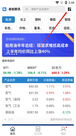 1、首先在对应站点下载并打开卓创资讯软件,进入首页后点击右上角的菜单栏,展开功能列表。