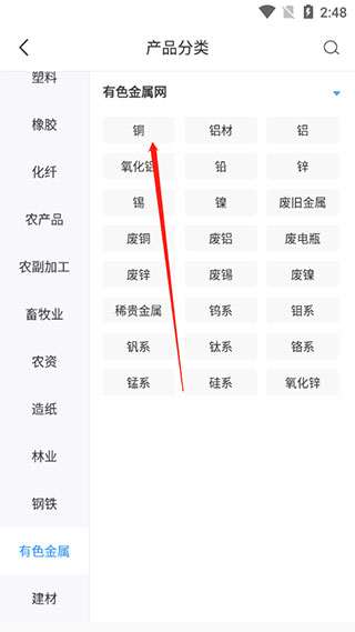 2、在菜单栏中找到 “有色金属” 分类选项,铜的相关信息归类在此分类下,点击进入该板块。