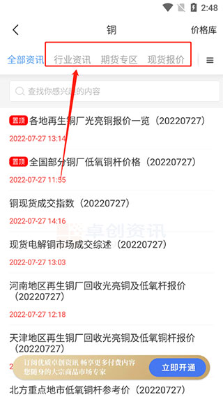 3、点击 “铜” 的选项后,即可查看各地铜的相关信息,包括价格表、行业资讯等内容,支持在线浏览。