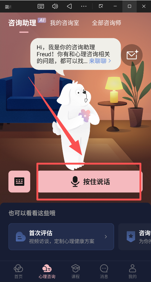 2、心理咨询页面有AI咨询助理,可以帮助用户定制心理健康方案和推进咨询师。