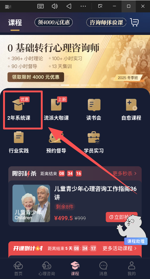 3、课程页面,用户可以选择自己需要的课程,课程内容主要分为心理咨询师培养和用户深入了解心理方面知识两大类。