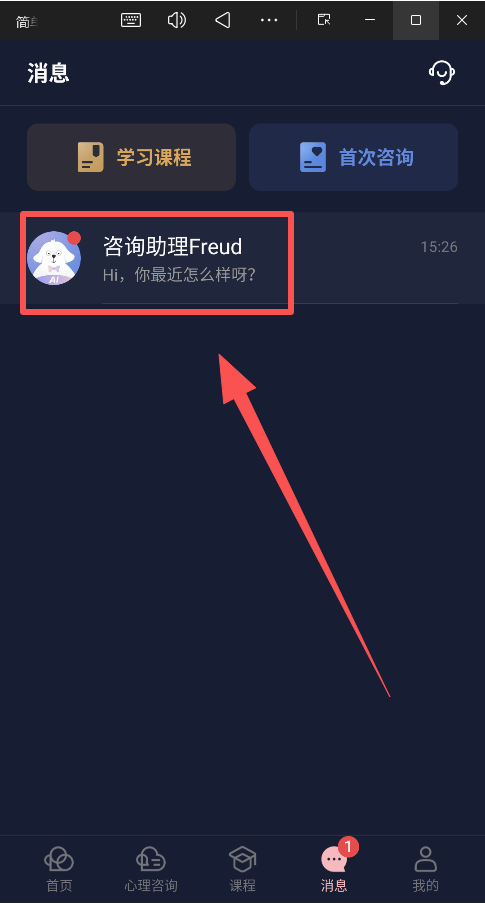 在消息中心页面,用户可以集中查看已购买课程的学习进度和最新动态,同时也能查阅与预约咨询师的对话记录和预约安排,方便用户统一管理所有学习与咨询事务。