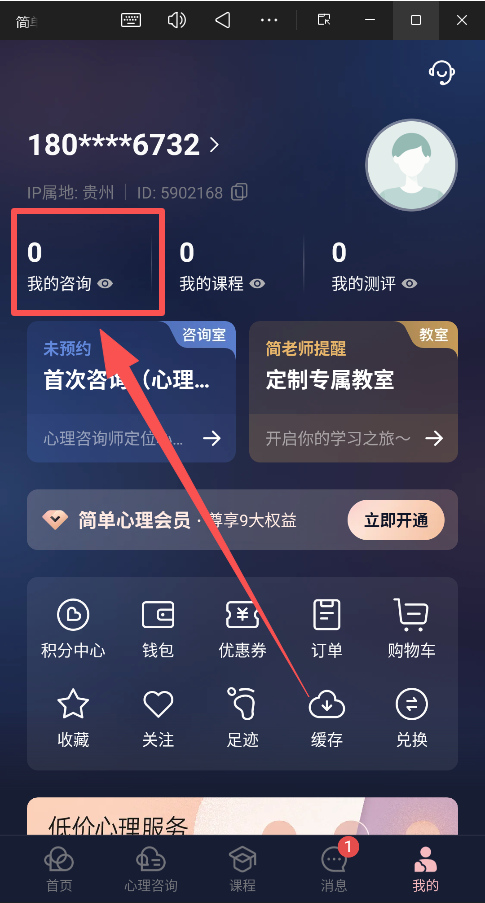 4、消息页面可以查看用户已经购入的课程和安排的咨询师消息情况。