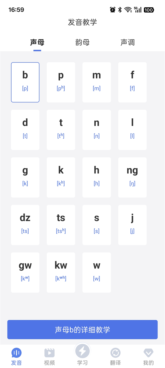1、粤语真人发音教学:提供基础粤语拼音教学,涵盖 19 个声母、53 个韵母及 9 个声调,搭配标准真人发音。