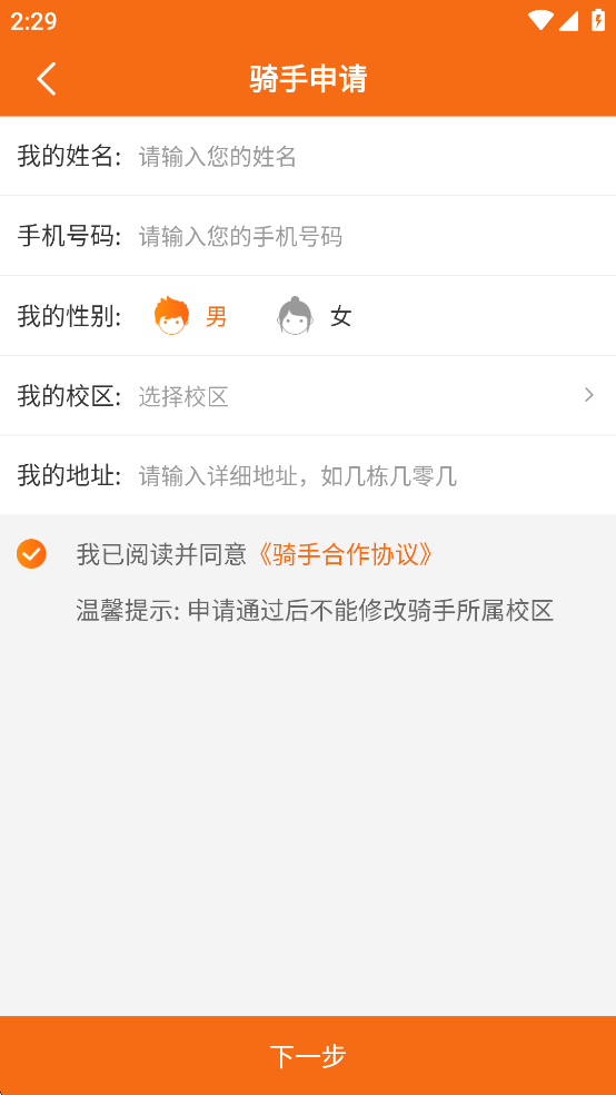 2、在个人中心界面中,找到并点击【骑手申请】选项,进入骑手申请流程页面。