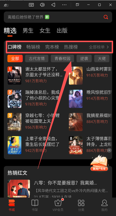 在 书城 的推荐位、榜单,或通过 分类 功能,寻找你感兴趣的小说。