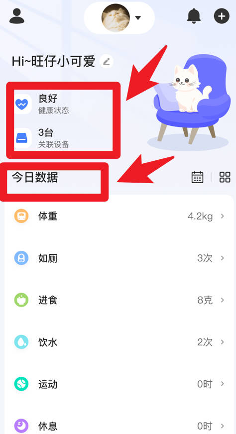 2、进入首页可查看猫咪健康状态与连接设备数量,并在今日数据中查看体重、如厕、进食、饮水等记录。