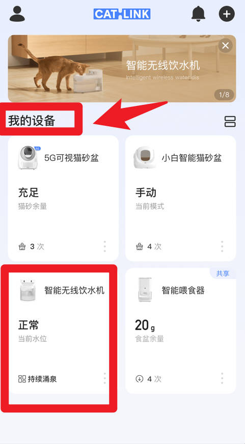 3、在我的设备页面可查看所有已绑定设备的状态与工作模式,如饮水机水位。
