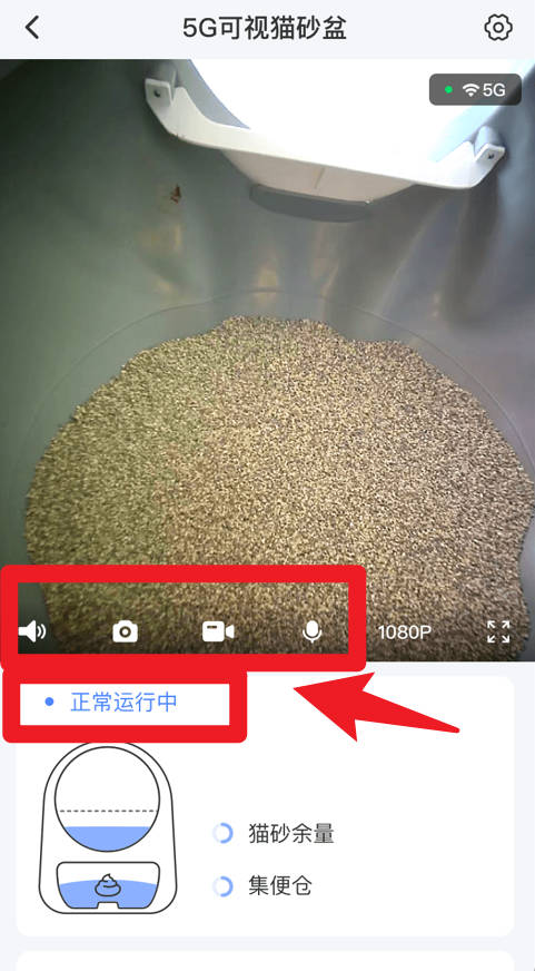 4、进入猫砂盆监控画面,可查看实时运行状态,并通过麦克风、摄像等功能远程互动。