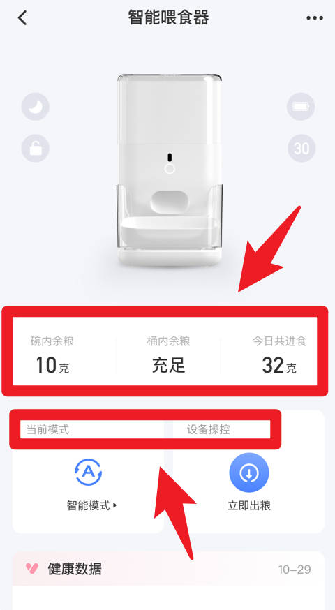 5、在智能喂食器界面可查看碗内与桶内余粮、今日总进食量,并选择智能模式或立即出粮进行操作。