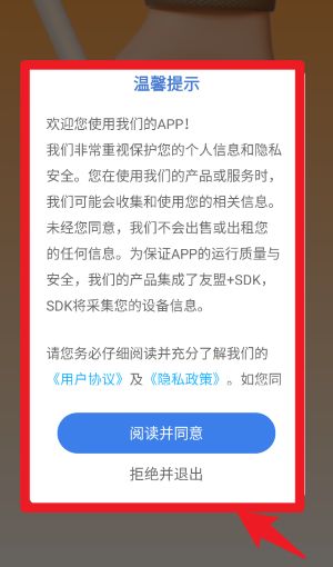 1、首次进入应用时,阅读并确认《用户协议》和《隐私政策》,点击阅读并同意即可继续进入APP体验。