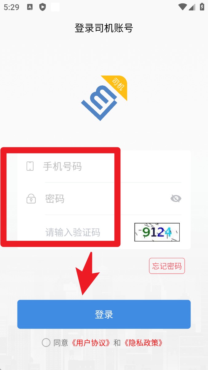 1. 打开APP后,输入手机号、密码及验证码,然后点击登录按钮。请务必勾选下方的《用户协议》。