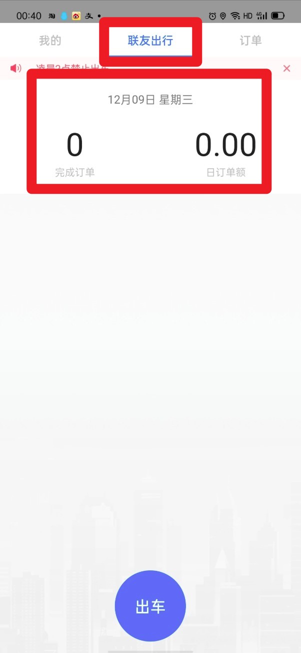 2. 登录后进入联友出行主页面,可查看当天已完成订单数量及对应总金额,方便快速掌握日常运营情况。