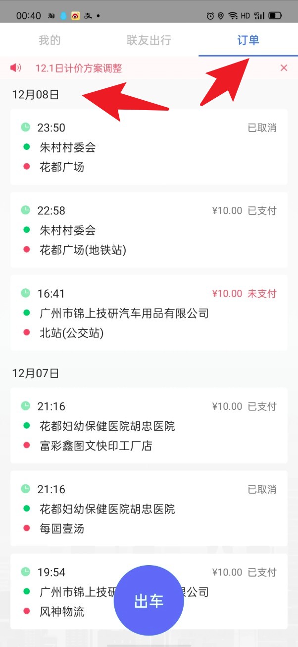 3. 点击上方订单标签,可以查看过去几天的行程记录,包括起点、终点、时间、费用及支付状态,便于核对账务。