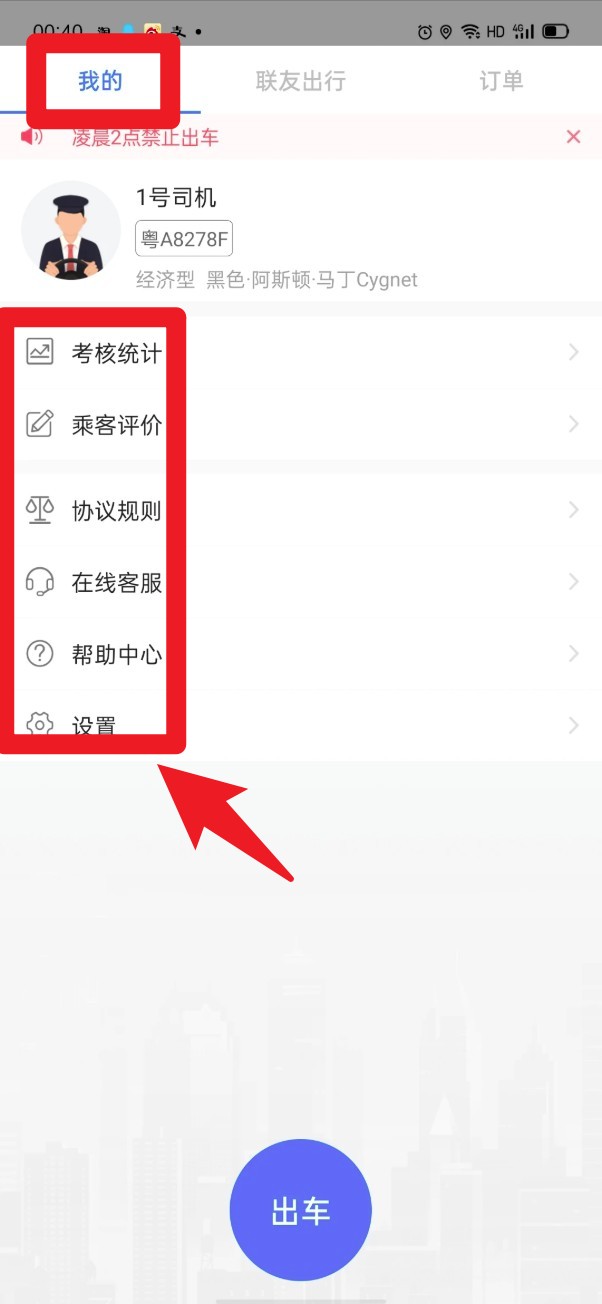 4. 点击我的标签页,进入个人中心,可查看司机信息、考核统计、乘客评价,可进入设置或联系客服获取帮助。