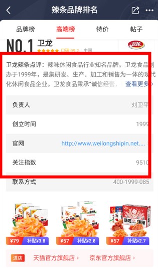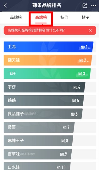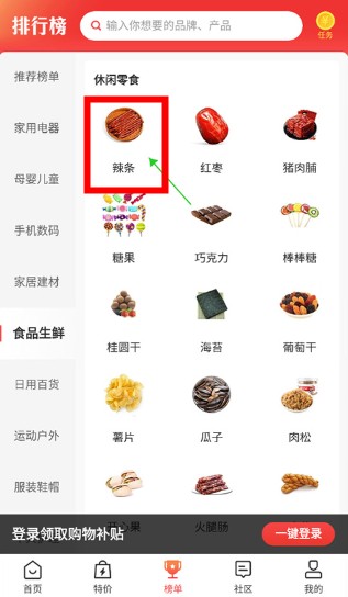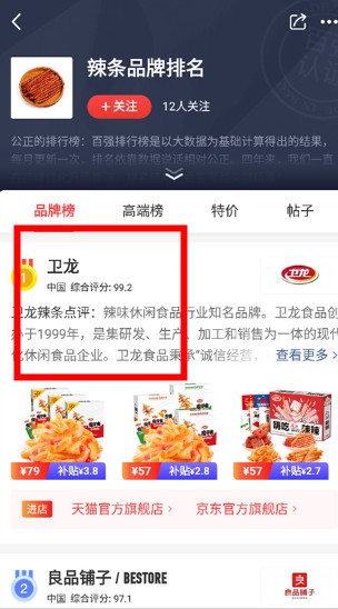 2.进入食品生鲜专区,点击辣条相关选项,页面会直接展示对应品牌的排行情况,一目了然。