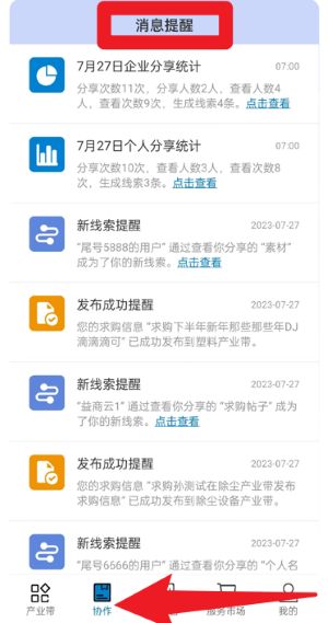 4、在协作页面的消息提醒中,可查看系统推送的企业统计、新线索、发布成功等信息提醒,及时跟进业务。