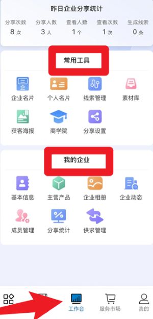 5、在工作台页面的常用工具和我的企业模块,可进行企业名片、线索管理、企业相册、供应管理等核心操作。