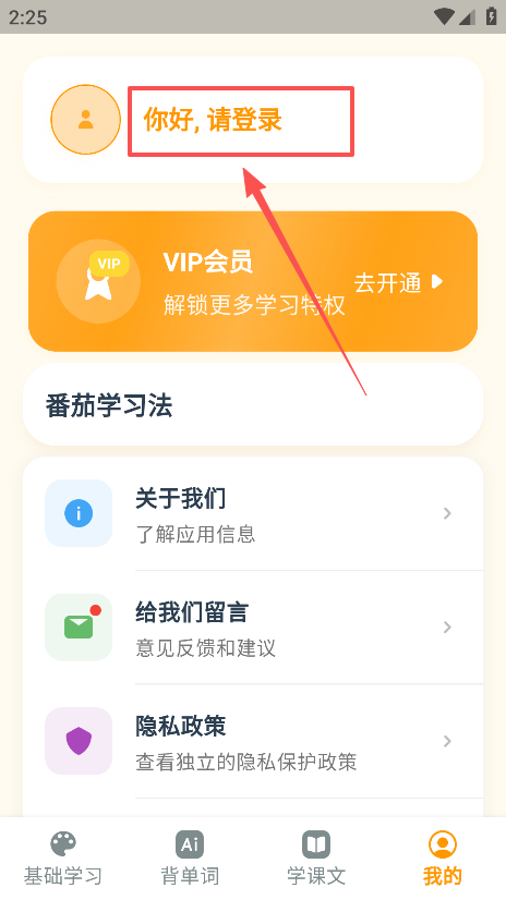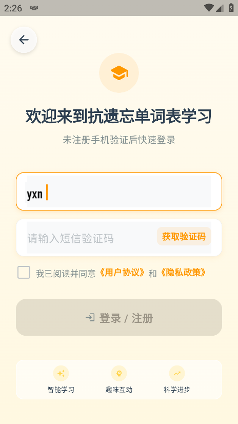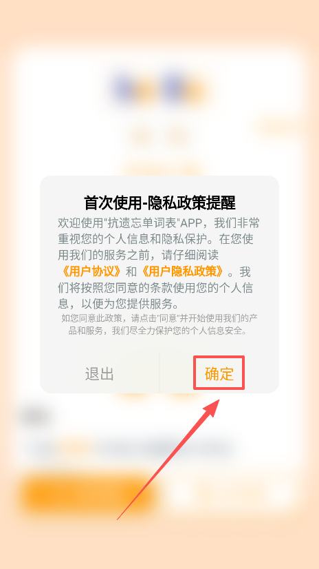 1、打开抗遗忘单词表 app,阅读并同意相关协议。