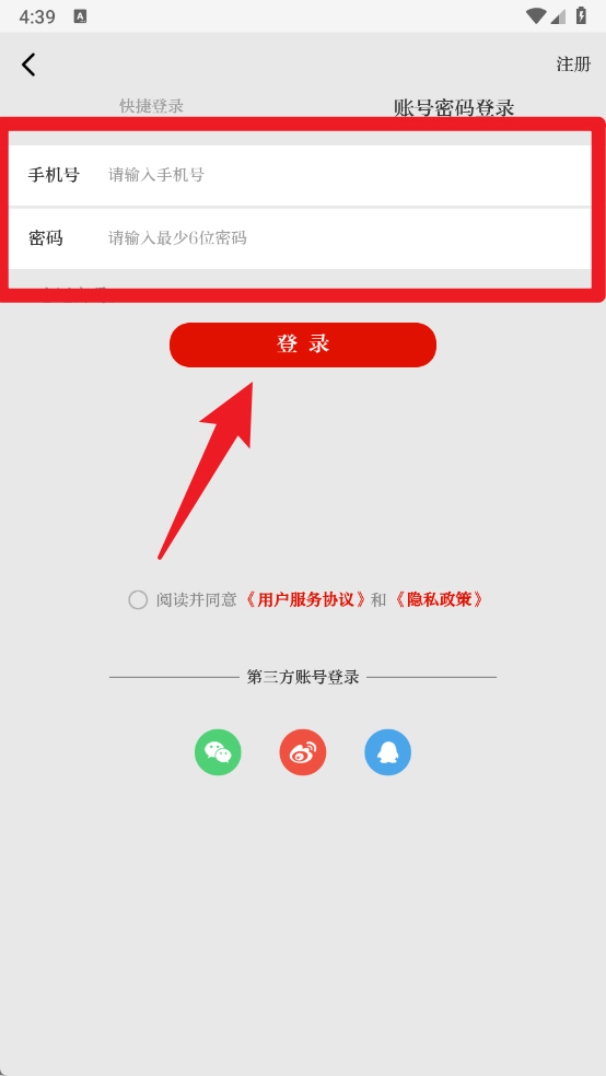 1、打开APP后,在登录页面输入绑定的手机号与至少6位数密码,勾选同意协议后点击登录进入系统。