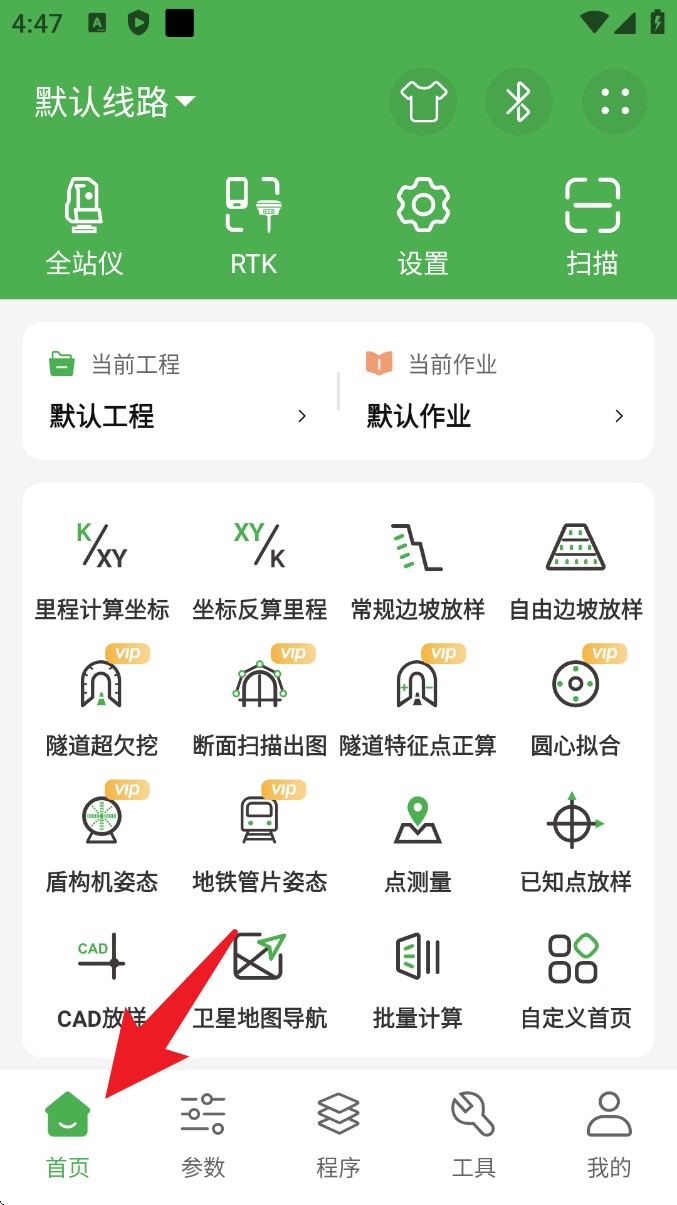 1. 进入首页后,可查看默认工程与默认作业,点击功能区可选择RTK、全站仪、设置或扫码等操作。