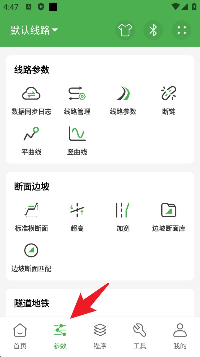 2. 切换至参数页,可以设置线路参数、管理线路信息,可以进入断面边坡模块,进行超高、加宽等边坡处理设置。