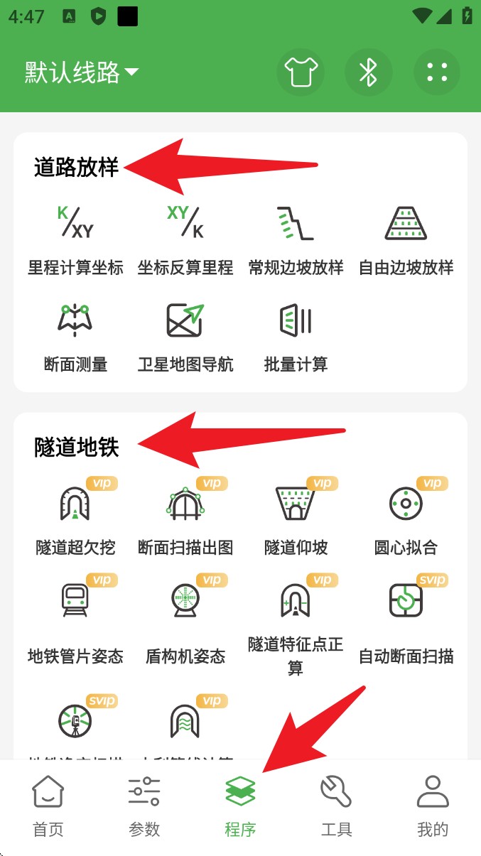 3. 进入程序页,可看到道路放样与隧道地铁模块,包括断面扫描、盾构姿态、自动断面扫描等功能入口。