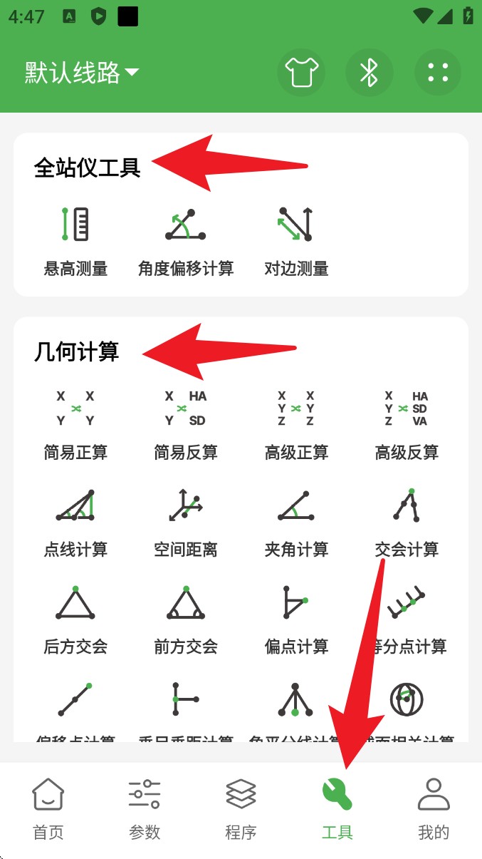 4. 点击工具页,可使用全站仪工具和几何计算,包括角度偏移计算、交会计算、空间距离等辅助测量功能。
