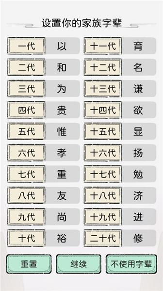 2、接着选择家族字辈,有二十代可以选择;