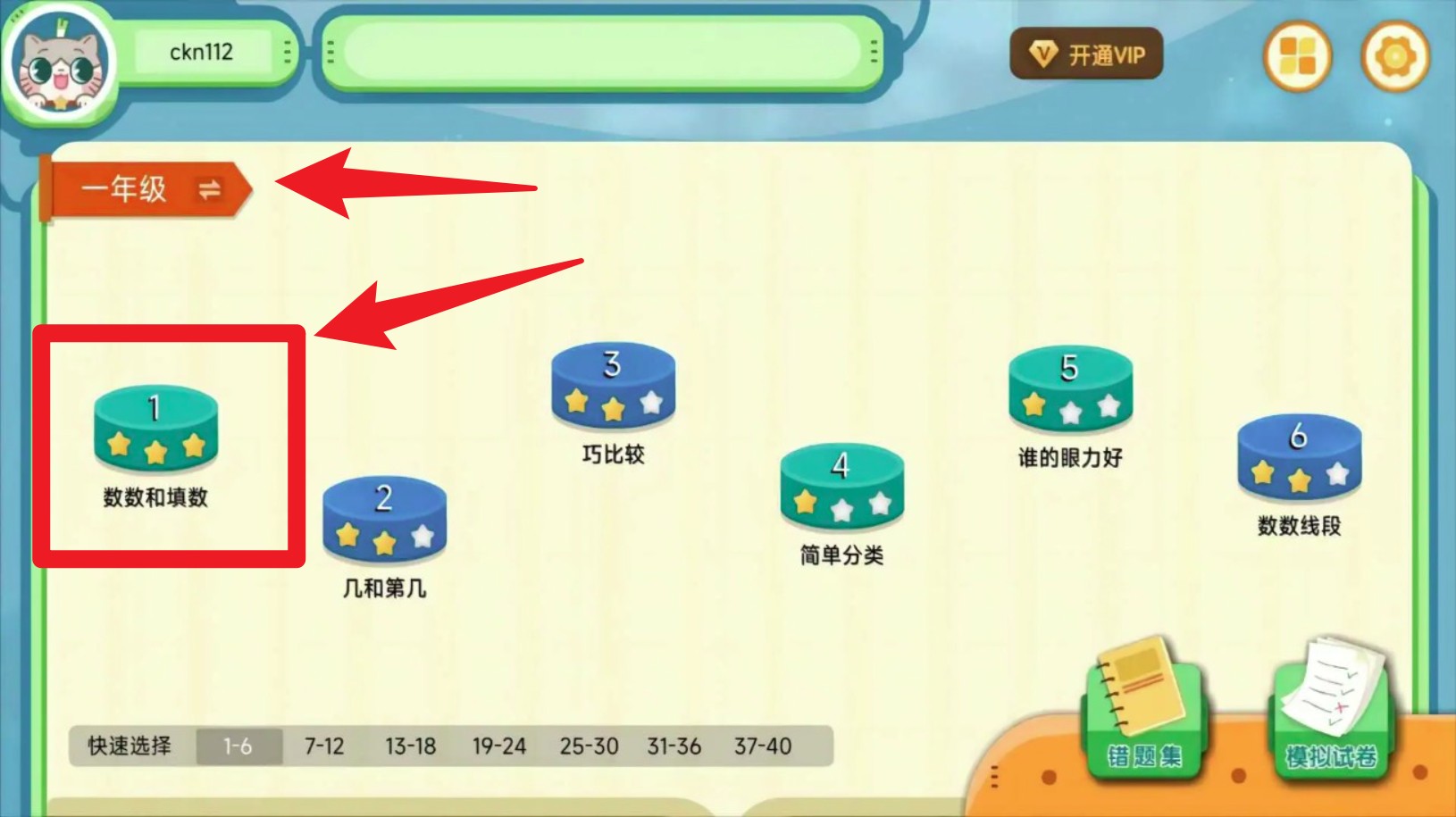 2. 登录成功后,选择当前年级,点击第一个单元数数和填数开始对应知识点的学习。