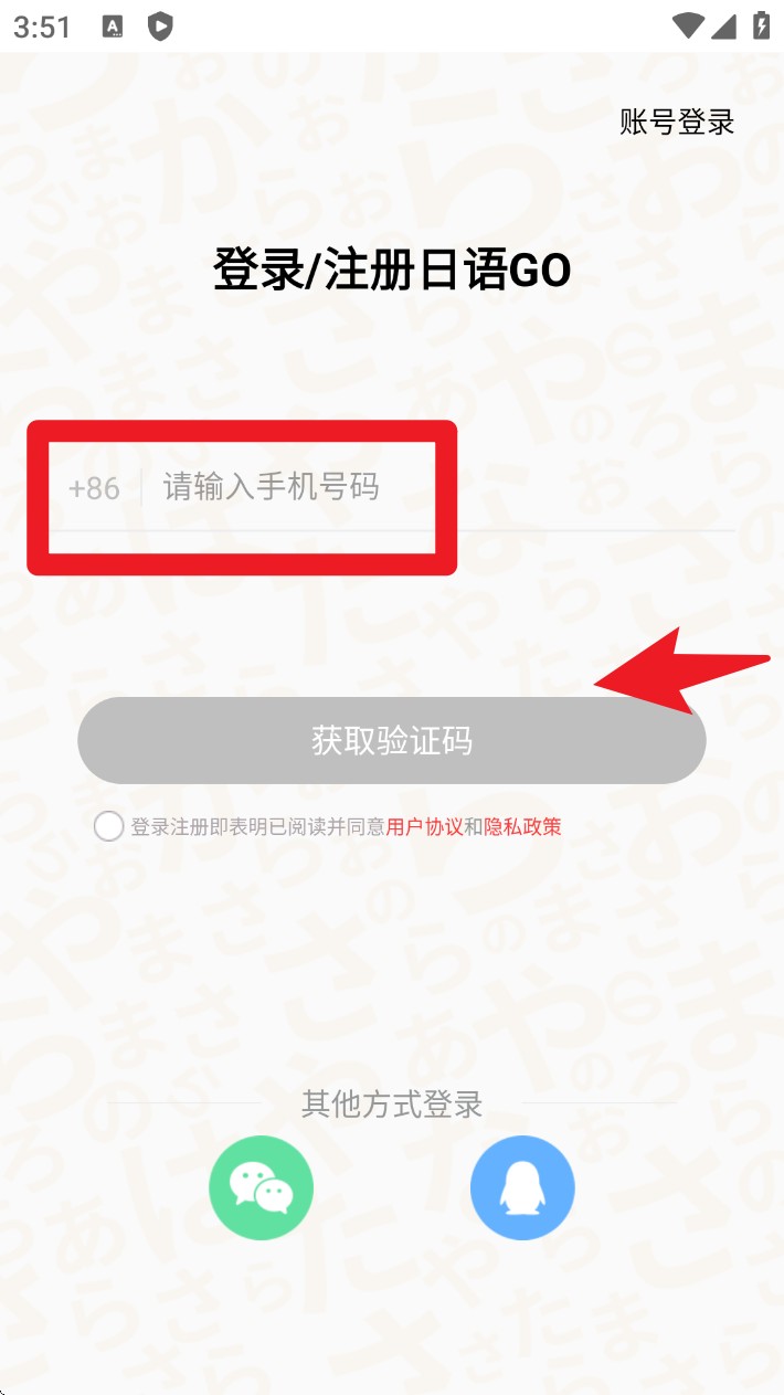 1. 在登录页面中输入手机号并勾选协议,点击下方的获取验证码按钮以接收短信进行登录注册。