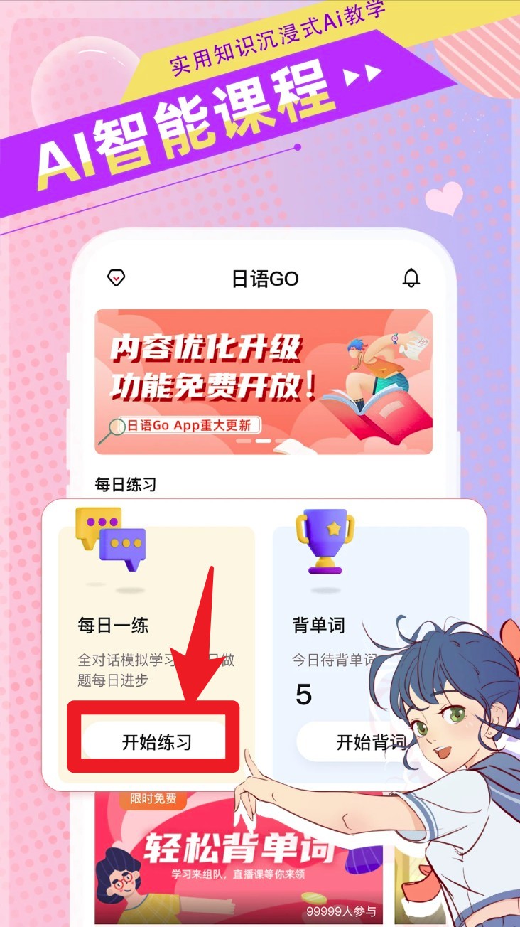 2. 登录成功后进入首页,点击每日一练模块下方的开始练习按钮,进入每日对话模拟训练。
