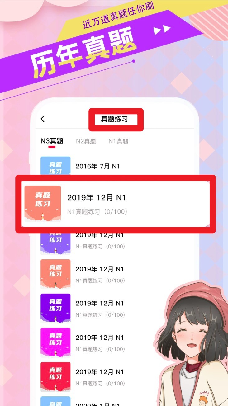 3. 在真题练习页面中选择对应级别与考试日期的试题,如2024年12月的N1,即可进入历年真题练习。