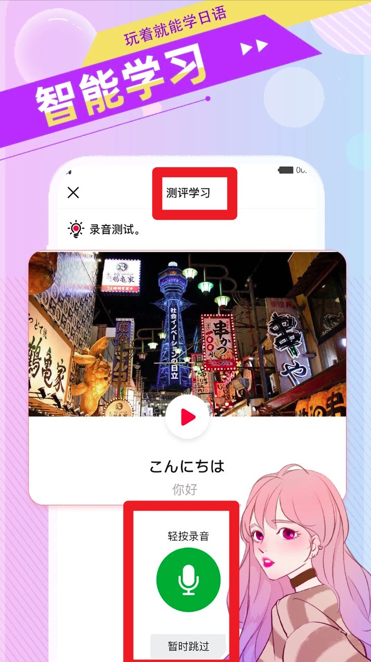 4. 进入测评学习页面后,根据页面提示点击录音按钮,进行口语测评练习,训练标准日语发音。