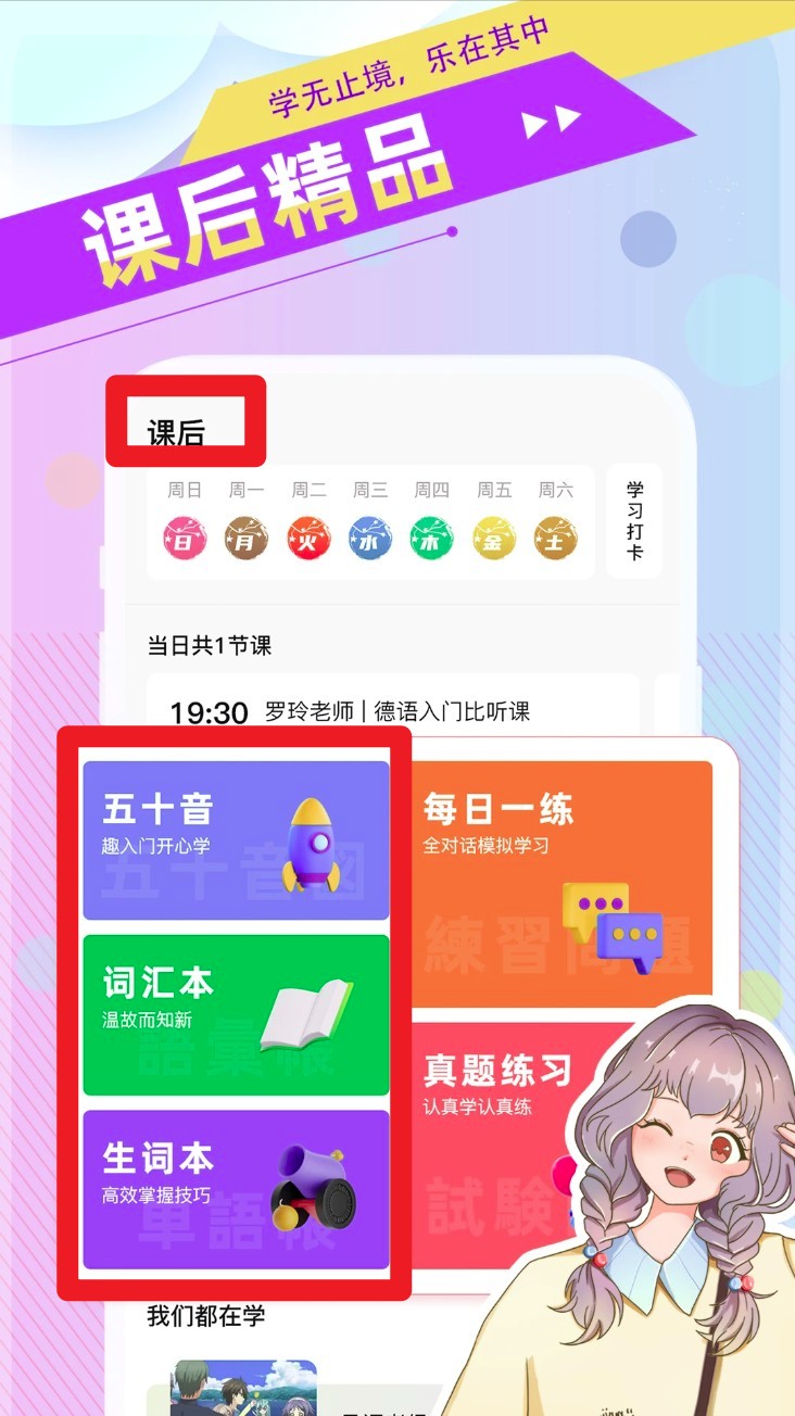 5. 在课后栏目中点击五十音、词汇本、生词本等模块,系统会推荐对应课后复习内容,帮助巩固知识点。